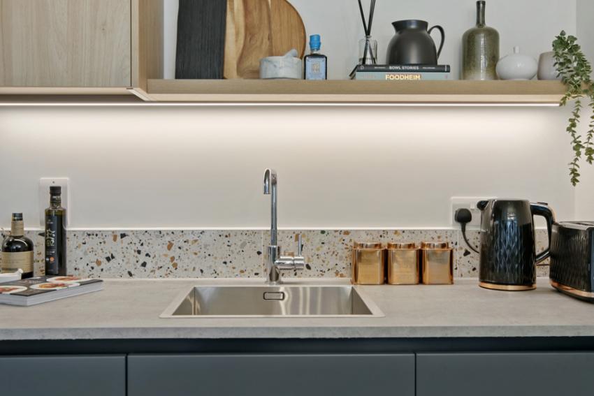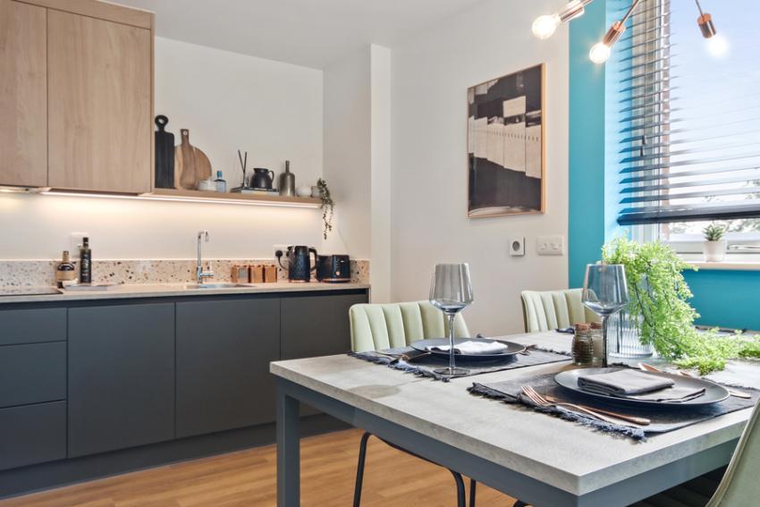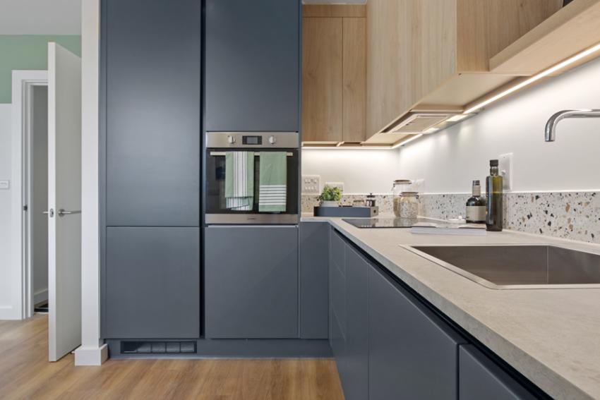 • The kitchens feature handleless units and a range of integrated Indesit appliances for a sleek, contemporary look.