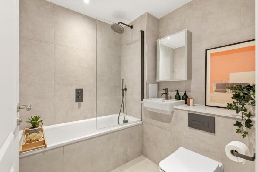 • Fully tiled bathrooms with Spanish tiles. Wall mounted Gunmetal shower head. Mirror vanity unit with storage, LED and shaver socket. Fixtures in Gunmetal include hand held shower, bath/shower screens, sink mounted taps, towel radiator.