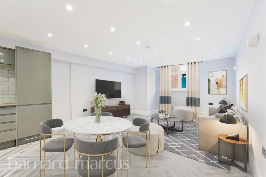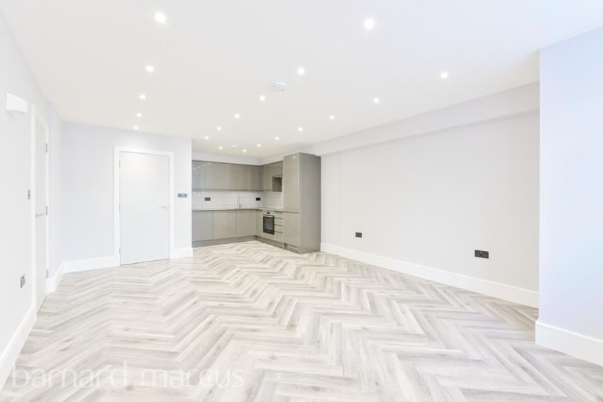 Entrance hallway with contemporary herringbone wooden flooring leading to the bright and spacious 23ft open plan living space with a bespoke fitted kitchen complete with integrated appliances included and stylish tiled splashback detailing. The bedroom has a unique set up with an entrance off of the hallway as well as a door into the lounge. Fully tiled bathroom with floating sanitary ware, bath with shower over, vanity sink and LED mirror.